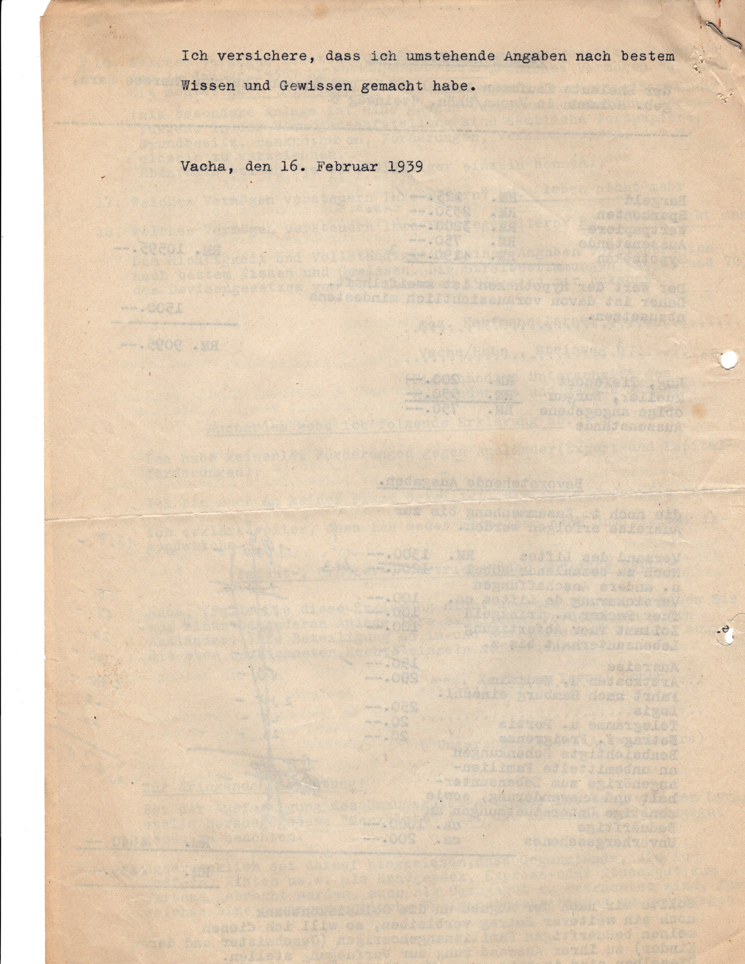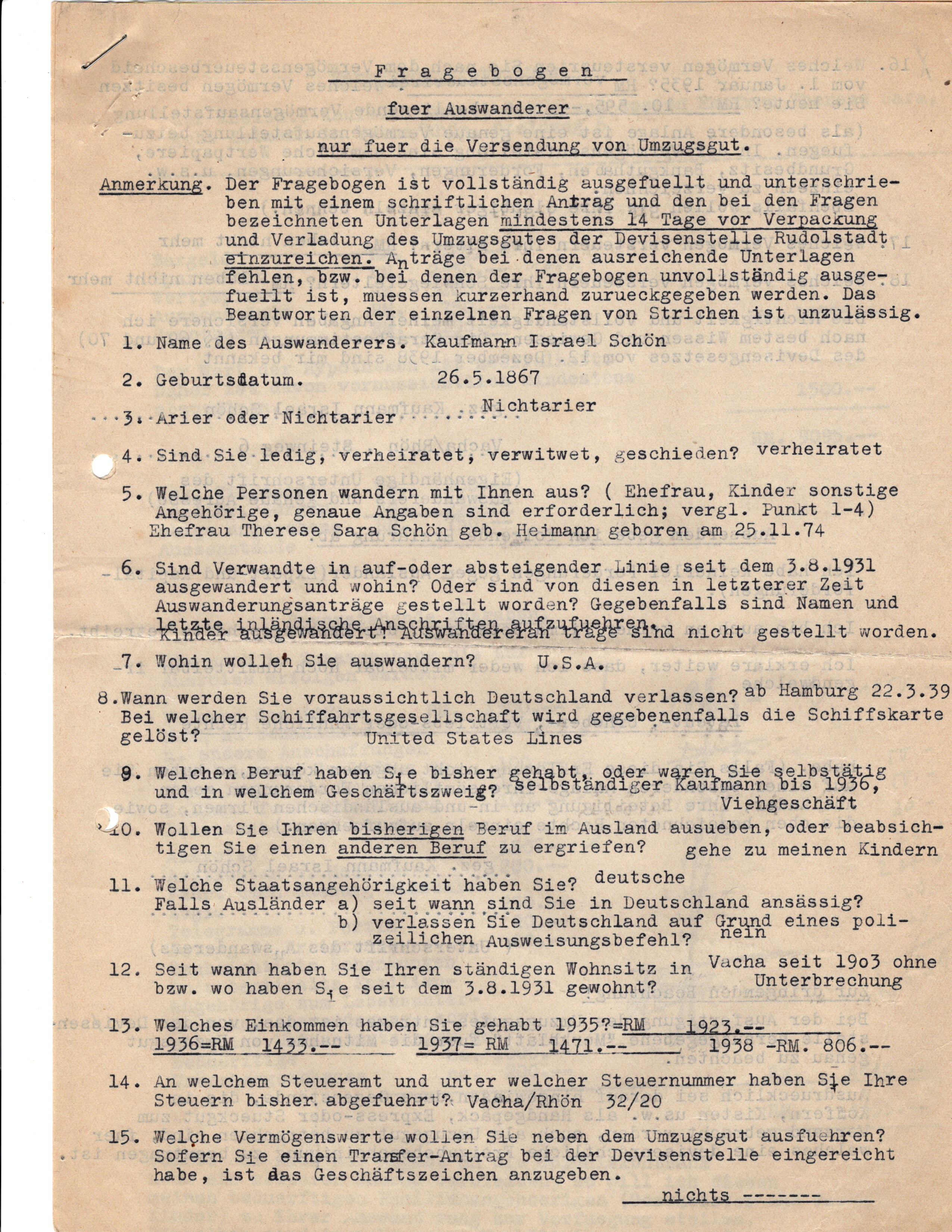 Below is an emigration questionnaire submitted by Kaufmann and Therese upon their emigration from Germany in 1939. In addition to questions regarding their religion and ethnic background, the questionnaire required all of their assets to be documented, accounted for, and partitioned for various fees of the regime. At the end, Kaufmann writes, “If, after submission to the Gold Discount Bank, I have another amount remaining, I will make it available to my needing family members for their exemption.”