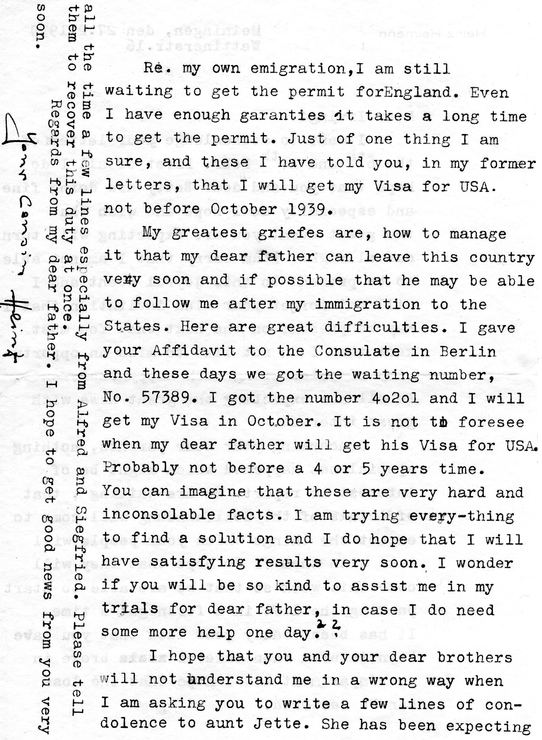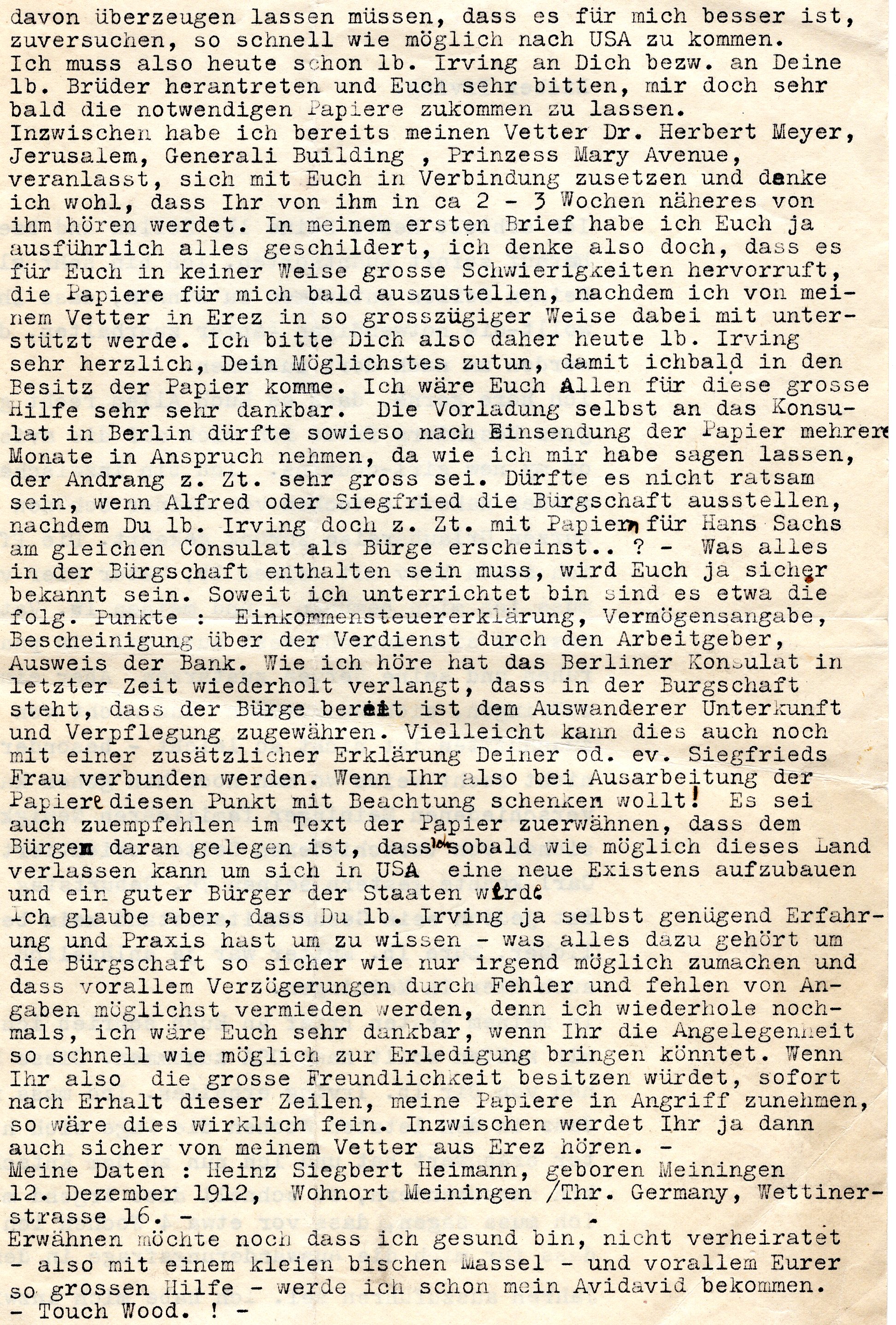 I hear frequently about your well-being from M Prinz, which pleases me greatly. I hope that all of your other loved ones are well, especially your dear parents. I., took, am healthy, emotionally at a high point; everything else must be borne with patience. May our loving God stand by us. Thank God, I am staying with very good people, and I feel very much at home here. Dear Irving, I want to ask you to send me the following so that I can complete [my application for] the visa; then everything will be together, and then if [unintelligible] I can depart quickly: a photostatic of Mr. Schoen’s latest income tax report, certified by the Treasury Department in Washington. I ask that you send this as quickly as possible to my address.