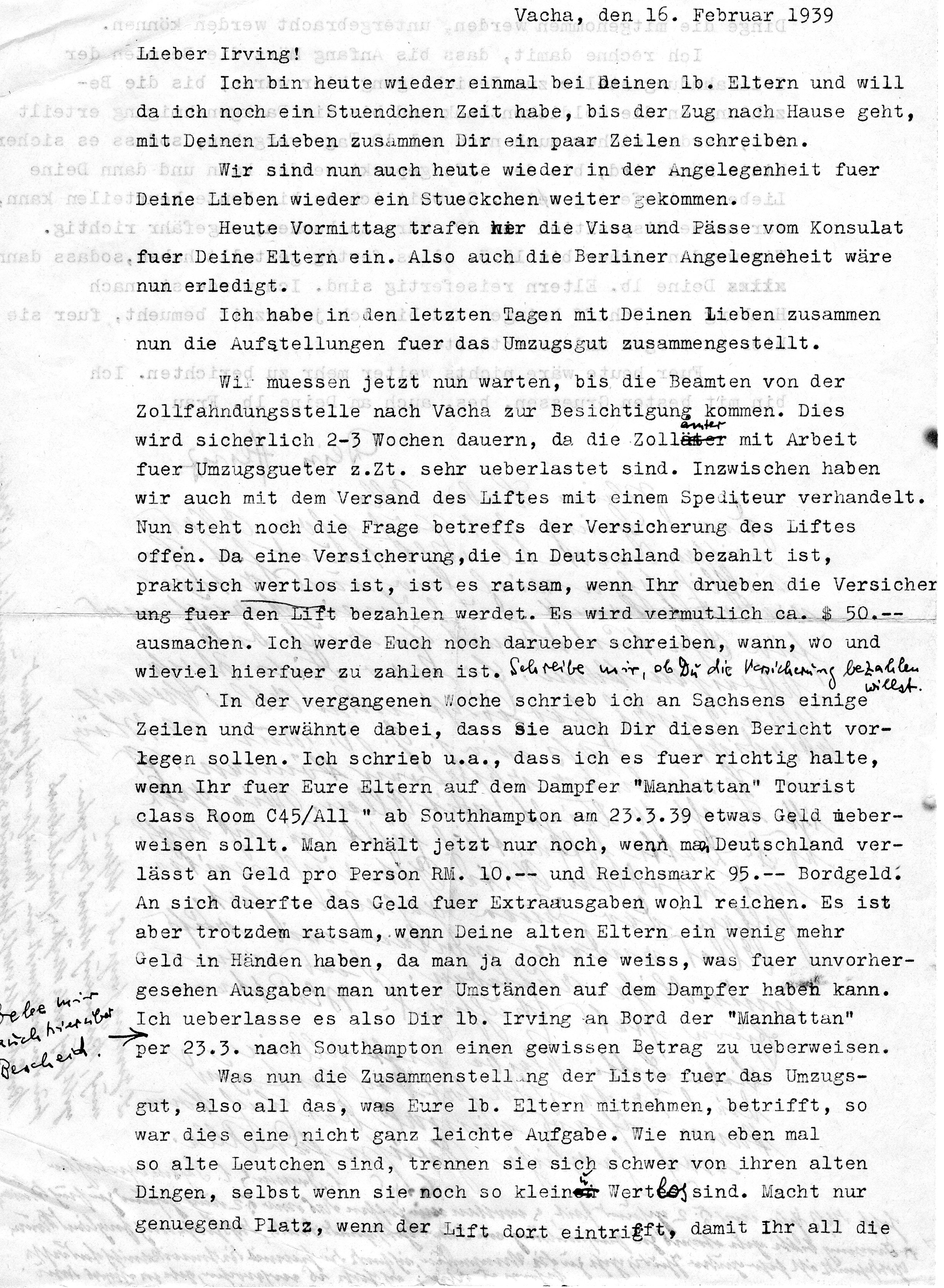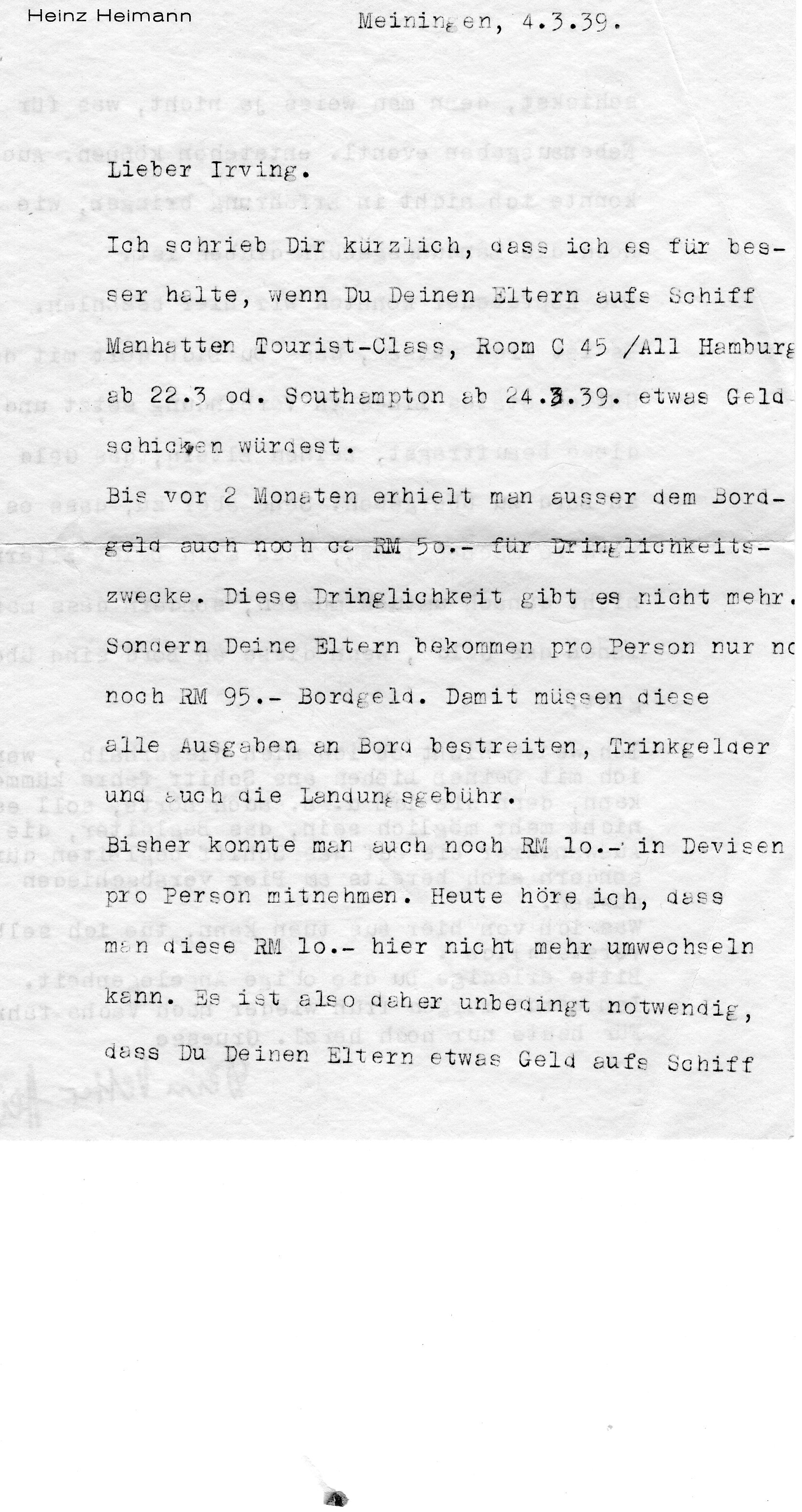 I recently wrote to you that I think it would be better if you put your parents on the ship Manhattan Tourist-Class, Room C 45 / All Hamburg from 22.3 or Southampton from 24.3.39. and sent some money.
