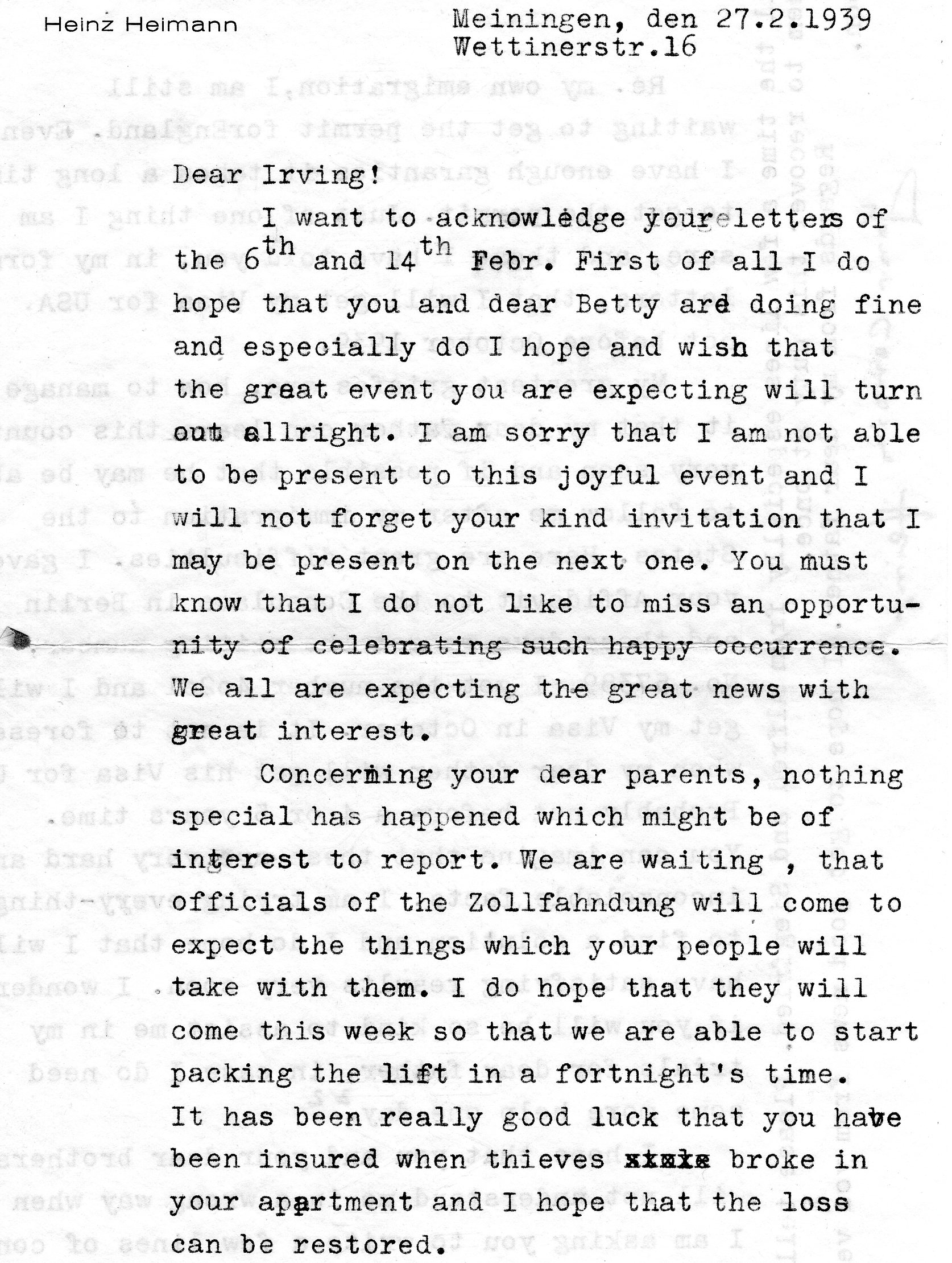 During this time, he corresponded often with his cousin Heinz Heimann, originally from Meiningen.