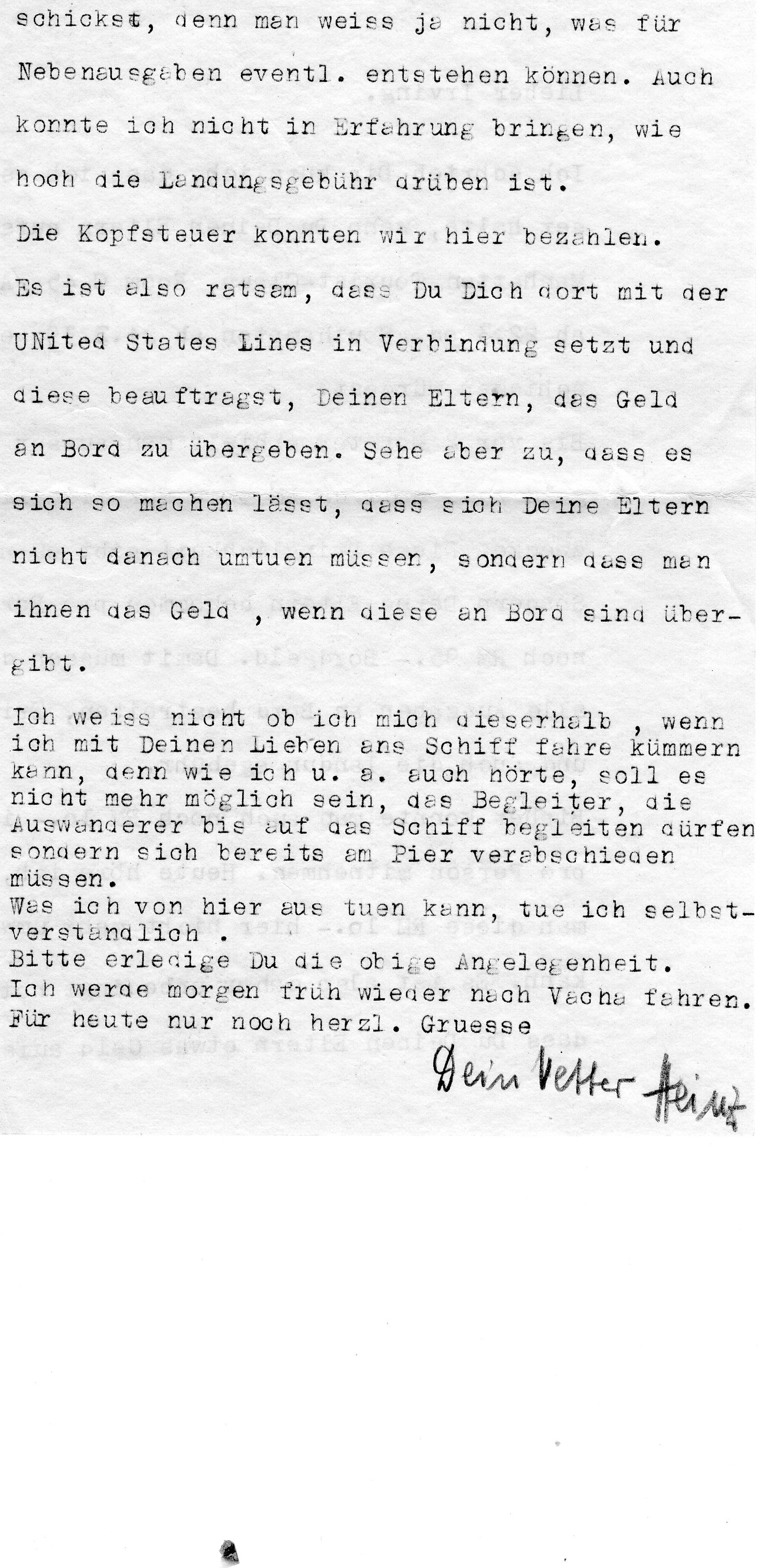 We could pay the poll tax here. It is therefore advisable that you contact the United States Lines there and instruct them to hand over the money to your parents on board. But make sure that it can be done so that your parents do not have to worry about it, but that you give them the money when they are on board.