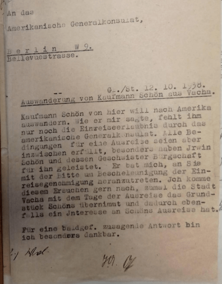 12.10.1938Kaufmann S. from here wants to emigrate to America. As he told me, he is